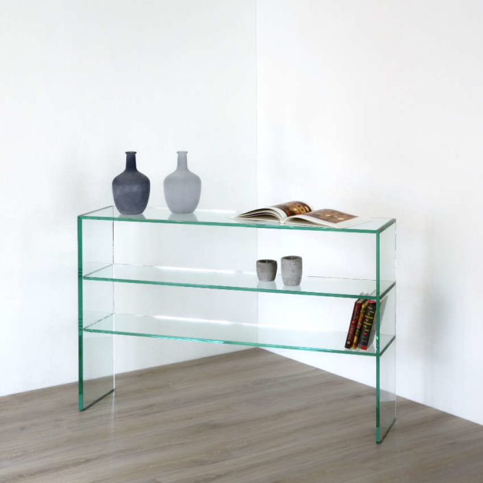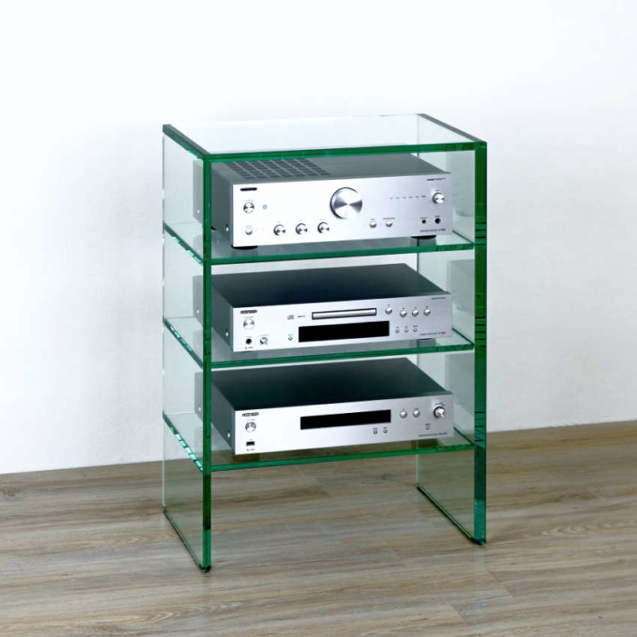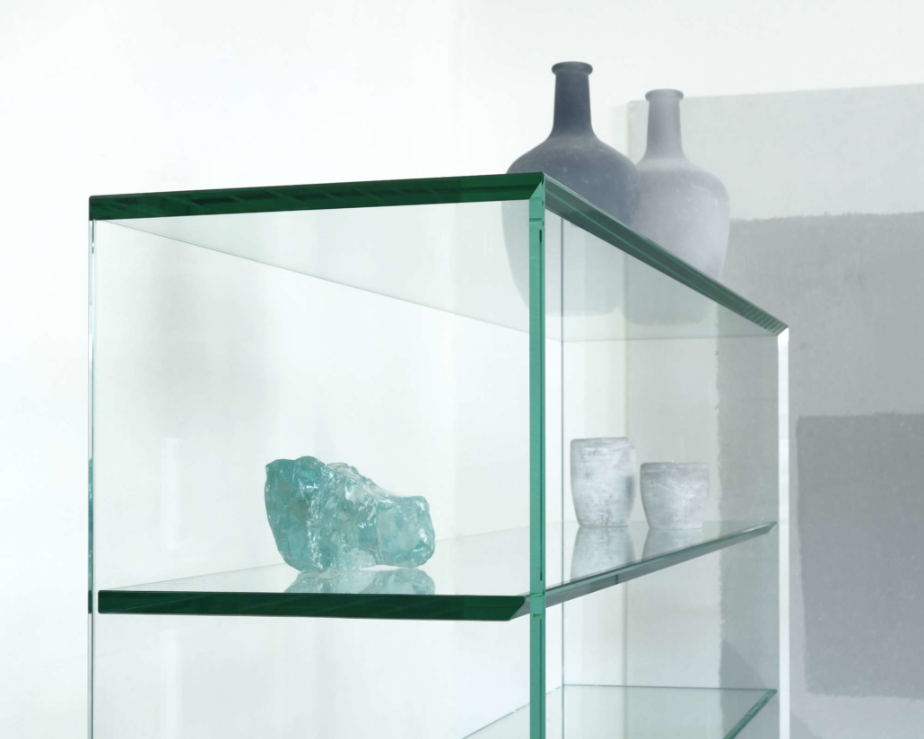 Wir verwenden 19 mm und 15 mm dicke Gläser, bei Zwischenböden der CD-Regale auch 12 mm dickes Glas.
