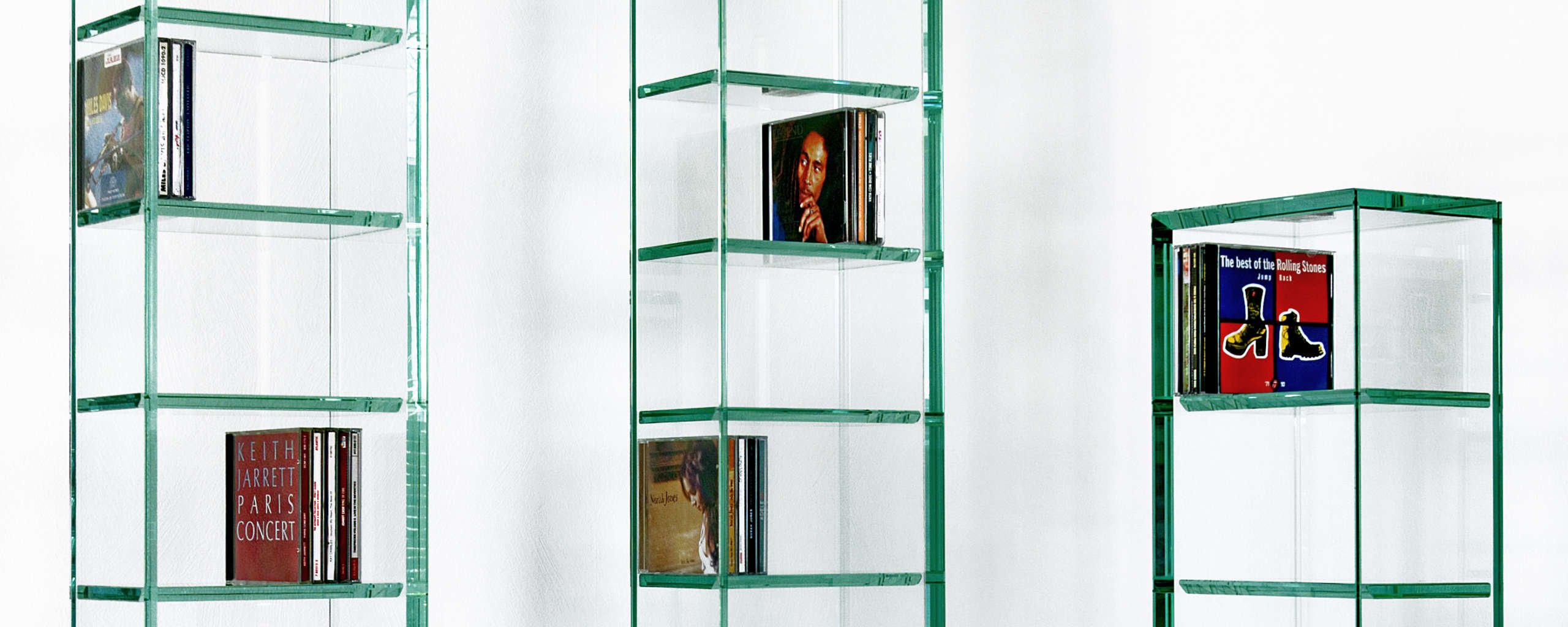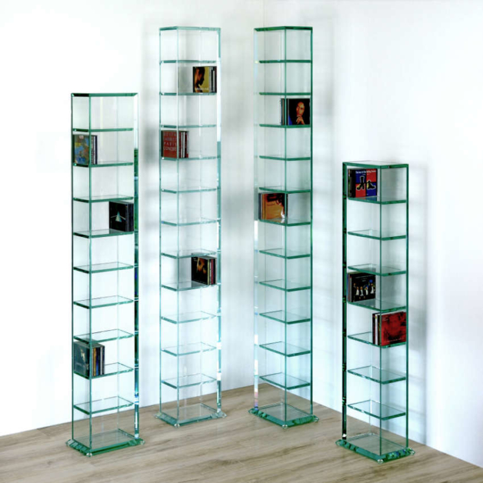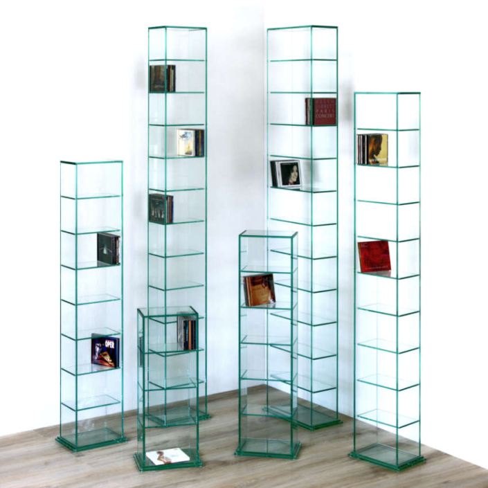 Für einen unserer Kunden aus Berlin haben wir dieses Glasregal Turrito mit einem Fach für DVDs und sieben Fächern für CDs gebaut, die Bodenplatte bündig mit dem Korpus des Regals abschließend. Wir bedanken uns bei unserem Kunden für die Erlaubnis der Veröffentlichung des Fotos auf unserer Website.