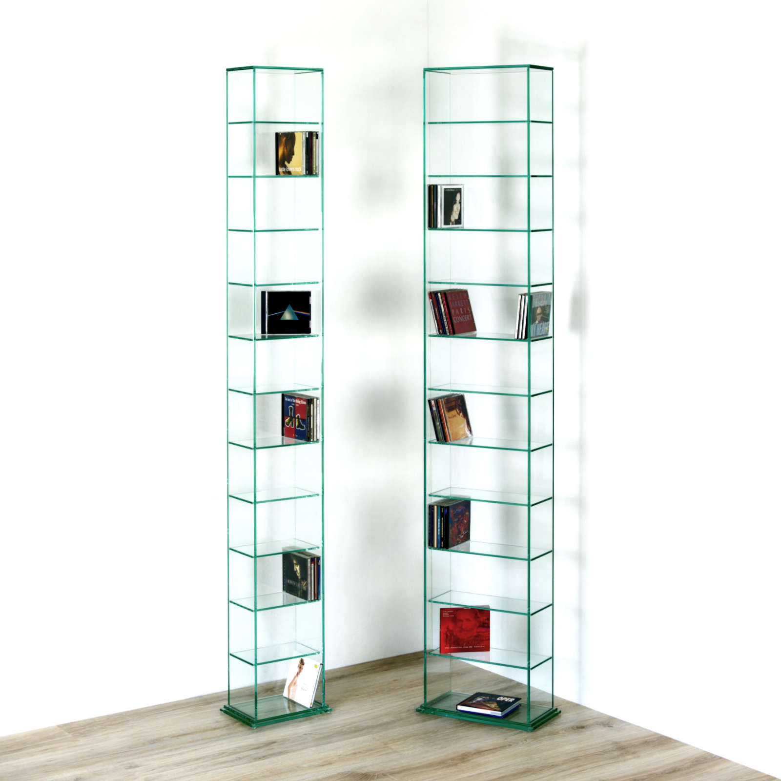 Das 181,8 cm hohe Glasregal Turrito für CDs, DVDs und BDs bieten wir in einer um 50 % verbreiterten Version an, um auch größere Sammlungen in einem einzigen Regal unterbringen zu können.