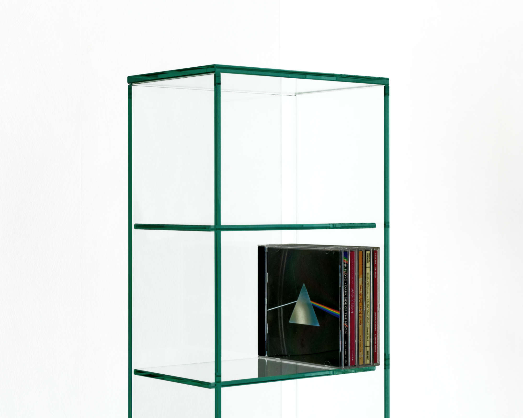 Die Glasregale Turrito bieten wir in allen Größen und Glassorten für CDs, DVDs und Blu-ray Discs an. Damit unterschiedliche Regale gut zusammen passen, variieren wir die Höhe der Fächer, nicht die Höhen der Regale.