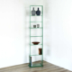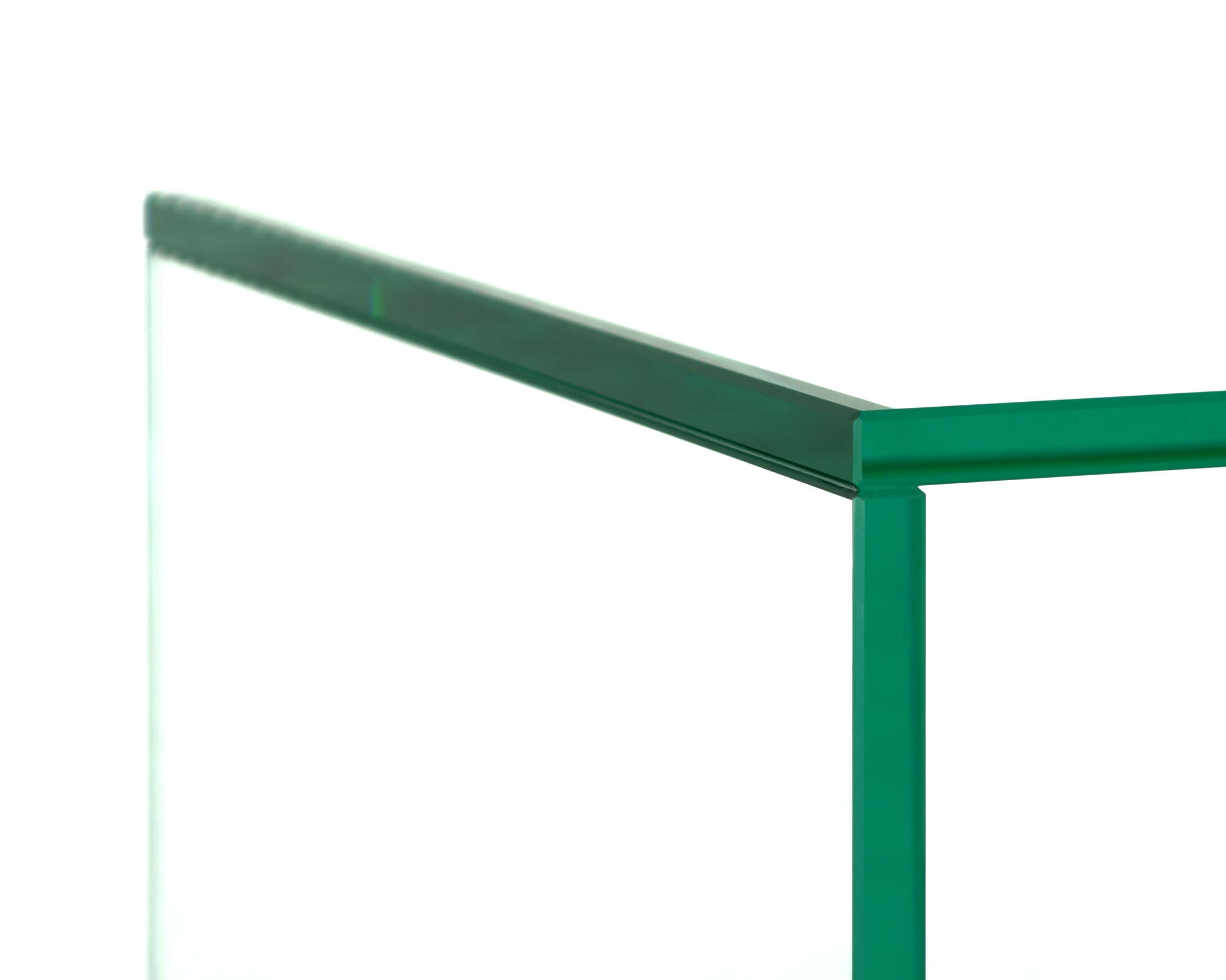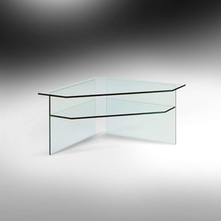 Der Tisch aus 10 mm dickem Klarglas besteht aus zwei Seiten, einer bündigen Tischplatte 42 x 42 cm groß und einem Zwischenboden, Fachhöhe 20 cm, ohne Bodenplatte, 42 cm hoch.