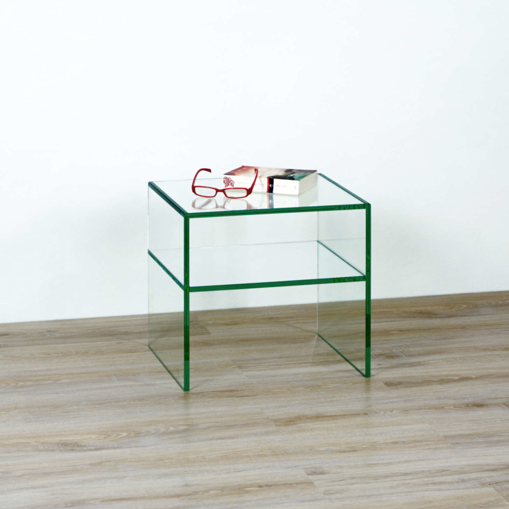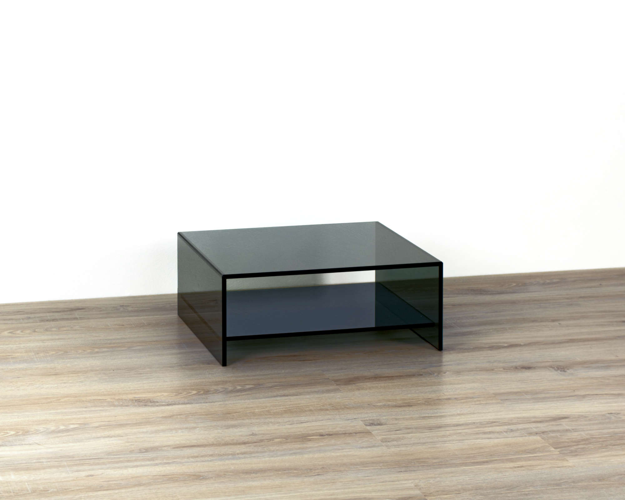 Hier auf dem Foto eine Maßanfertigung des Beistelltisches Alana aus 10 mm dickem Grauglas, mit einem Zwischenboden, der vorne und hinten etwas zurückgesetzt ist.