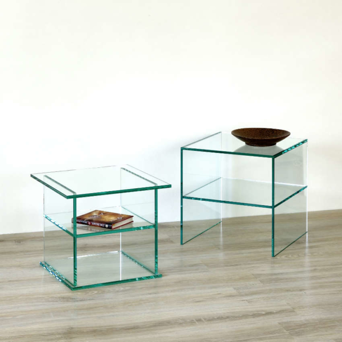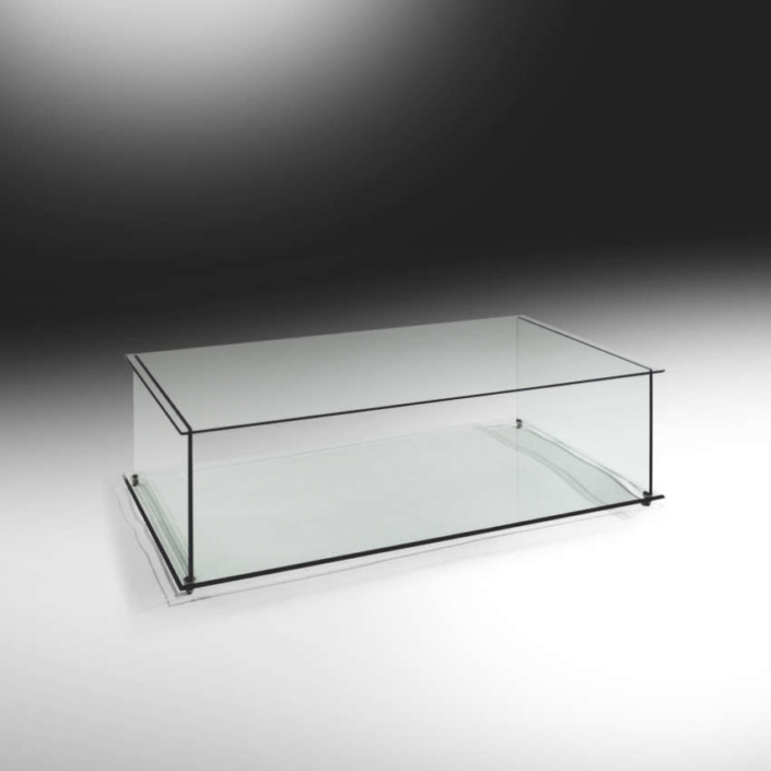 Die Glasplatte ist 12 mm, 15 mm oder 19 mm dick, wir fertigen sie in der von Ihnen gewünschten Größe individuell an und kleben Metallfüße aus Aluminium oder Edelstahl an. Die Ecken der Glasplatte sind leicht abgerundet.