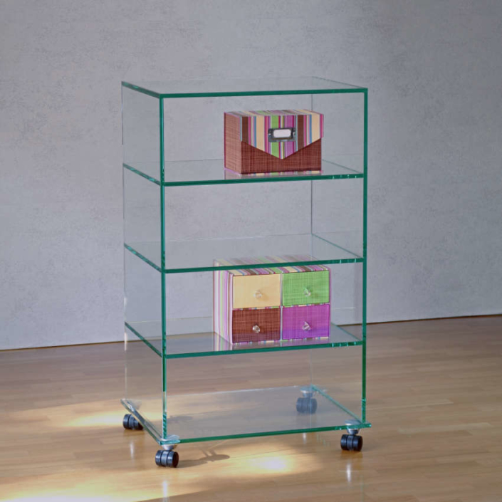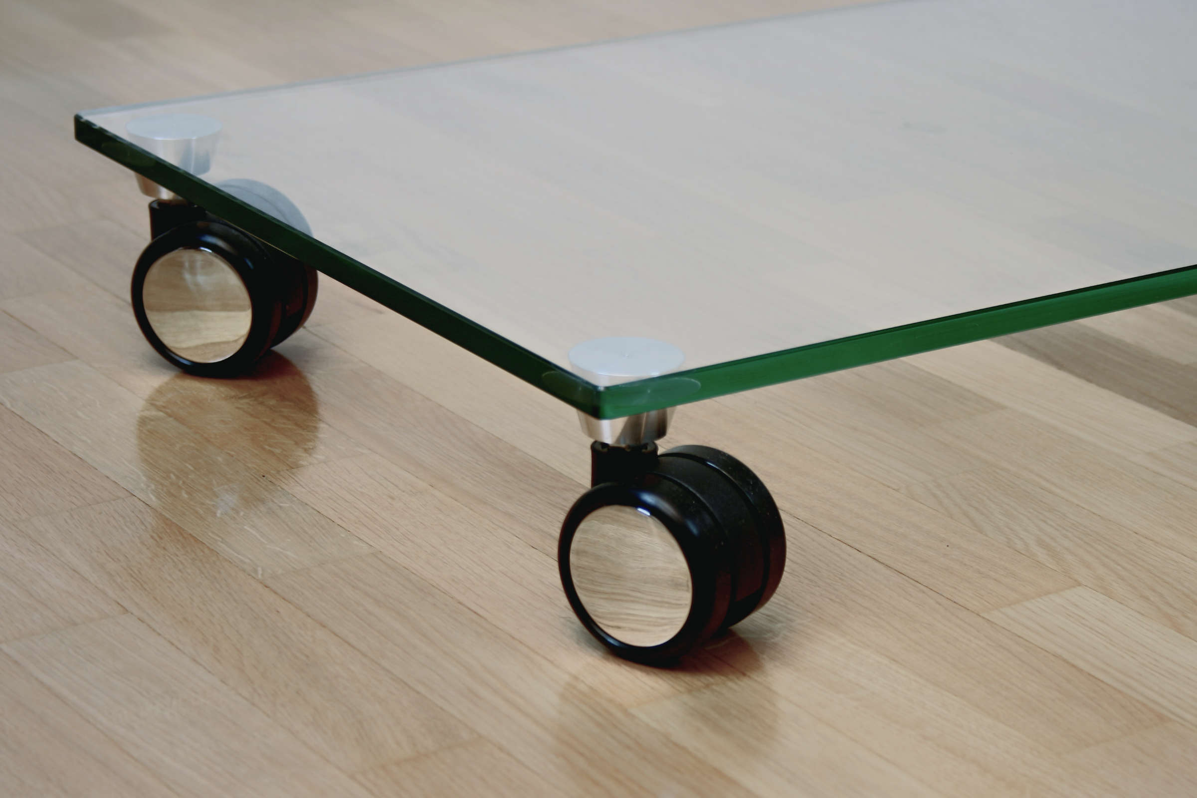 Hier ist eine 12 mm dicke Glasplatte mit Aluminiumfüßen und 65 mm großen Rollen zu sehen.