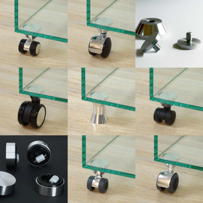 Das Zubehör lässt sich für viele unserer Glasmöbel verwenden. Die Metallfüße können wir unter Glasmöbel kleben, die über eine Bodenplatte verfügen.